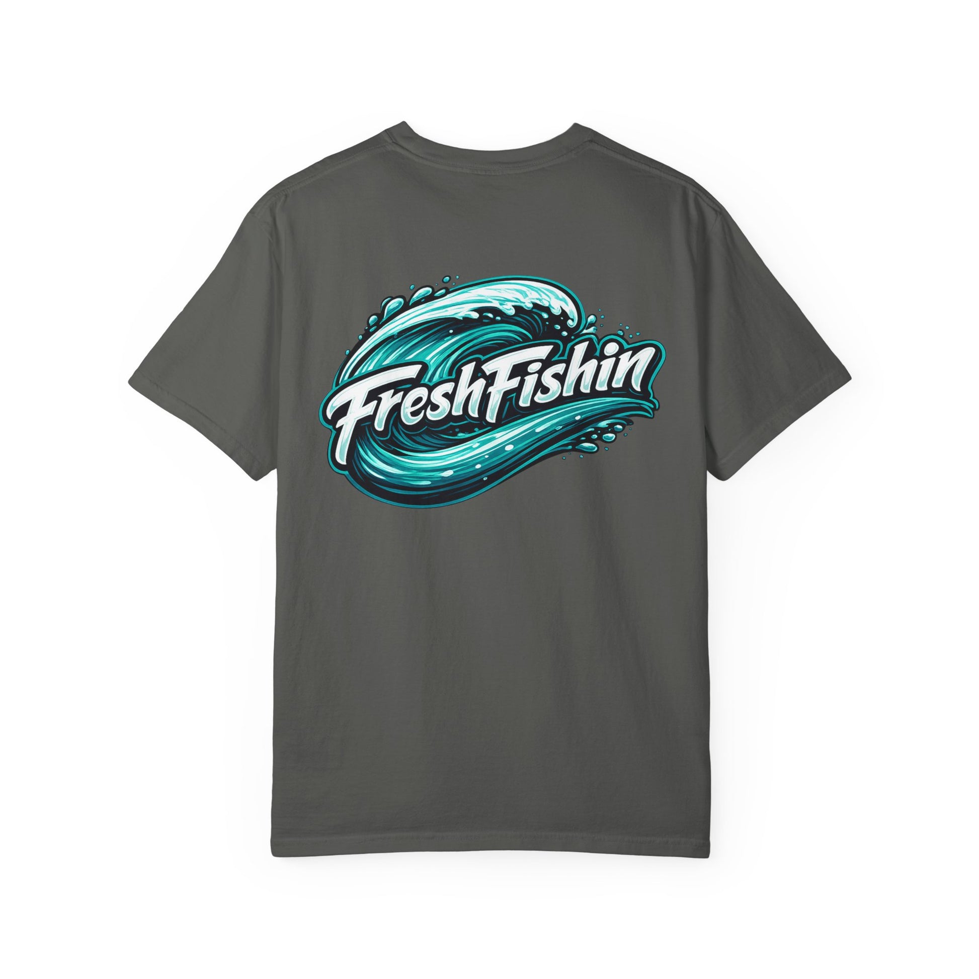 A lived-in tee made for days on the water and evenings swapping stories at the dock. The heavyweight, garment-dyed cotton has a soft, broken-in texture that picks up the sun and salt with character. A bold, rolling wave graphic sits over the heart and stretches across the back, its teal-and-cerulean sweep catching light like a wake. Wear it with your go-to shorts or layered under a flannel after a long cast. It feels familiar from the first wear and holds its shape through seasons of use.