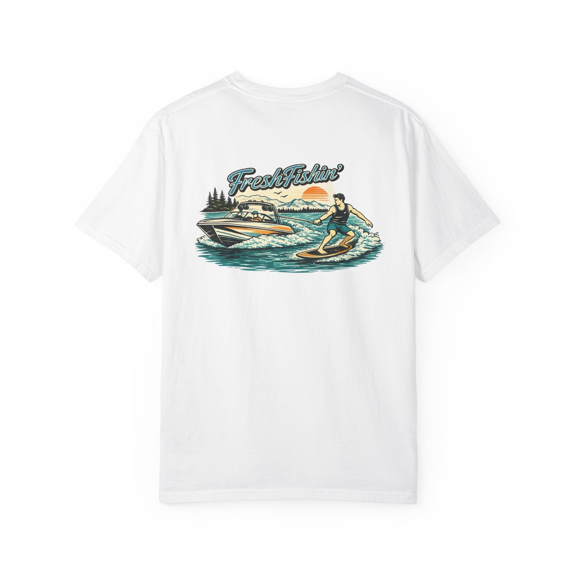 A relaxed, garment-dyed tee that carries the slow-summer vibe of lake days and salt-spray afternoons. Soft, broken-in cotton drapes easily over shoulders while a vintage-inspired surf-and-boat illustration sits on the upper chest and expands across the back — a small, confident nod to people who live for water, sunsets, and the hum of an outboard. Wear it to the marina, on a road trip to the cabin, or layered under a flannel for cooler evenings; the heavyweight knit feels substantial yet lived-in from the first wear, and the muted dye tones deepen with each wash. This is a shirt that reads like a memory: sun on your face, boards cutting wakes, and friends laughing at the stern.