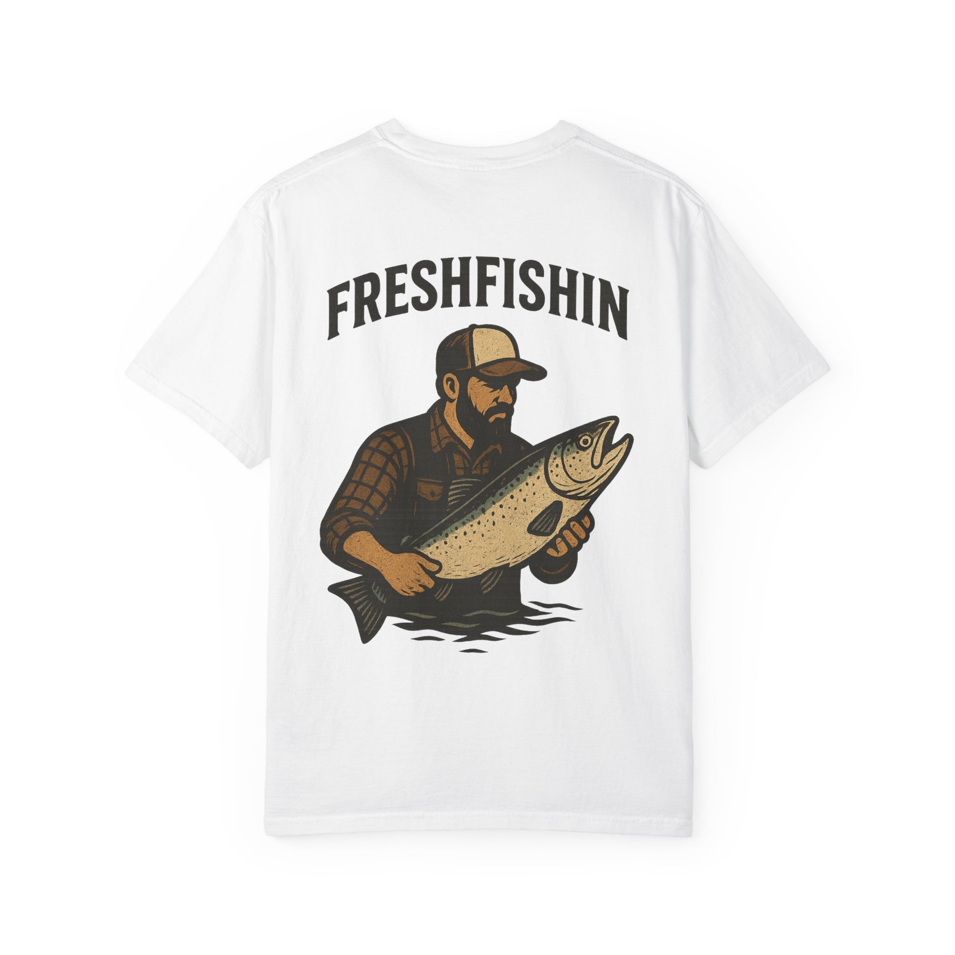 A soft, garment-dyed cotton tee made for people who live for early mornings on the water and the quiet satisfaction of a good catch. The relaxed fit and medium-weight fabric feel broken-in from the first wear, and the sewn-in label keeps the neckline comfortable. Front chest text offers subtle identity while the back features a bold illustrated angler holding a hefty fish — a nod to long days, cold hands, and stories that grow taller with every cast. Wear it to the boat ramp, the local bait shop, or around town when you want that outdoorsy, lived-in look.